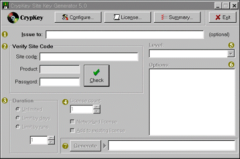 Site Key GeneratorÀÇ »ç¿ë CrypKey Instant¿¡ Æ÷ÇԵǾî ÀÖ´Â Site Key Generator('½ÃÀÛ'À» Ŭ¸¯Çϰí 'ÇÁ·Î±×·¥'¿¡¼ 'CrypKey Instant V5.X.XXX' ¸Þ´º¸¦ ¼±ÅÃÇÑ ´ÙÀ½ 'Site Key Generator'¸¦ Double ClickÇÔ)´Â 'CrypKey Instant'·Î ÇÁ·ÎÅØ¼ÇÇÑ ±ÍÇÏÀÇ Á¦Ç°¿¡ ´ëÇØ »ç¿ë±ÇÇÑ(Àϸí Site Key) Áï, Á¦Ç°»ç¿ë±â°£ ¶Ç´Â ȸ¼ö ±×¸®°í ÄÄÄ¿·»Æ® ³×Æ®¿öÅ© »ç¿ëÀÚÀÇ ¼öµîÀ» ÀÓÀÇ·Î Á¶Àý ºÎ¿©ÇÒ ¼ö ÀÖ´Â ±â´ÉÀ» °®°í ÀÖ½À´Ï´Ù. ´ÙÀ½ÀÇ '5.1Ç×'ºÎÅÍ '5.3Ç×'±îÁö ¼ø¼´ë·Î ÀÛ¾÷À» ¼öÇàÇϽʽÿÀ. Configure ¼±ÅÃ